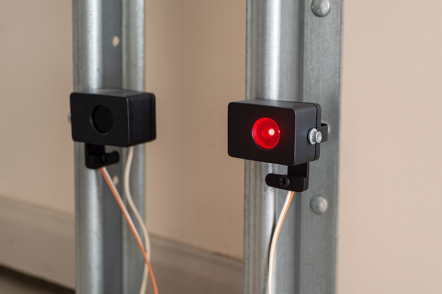 Garage door safety sensors are tiny units mounted on either side of your garage door, usually a few inches off the ground. They function by emitting an invisible infrared beam between them. If anything breaks the beam—such as a pet, a person, or an object—the sensors alert the opener to stop or reverse the door to avoid injury or damage.